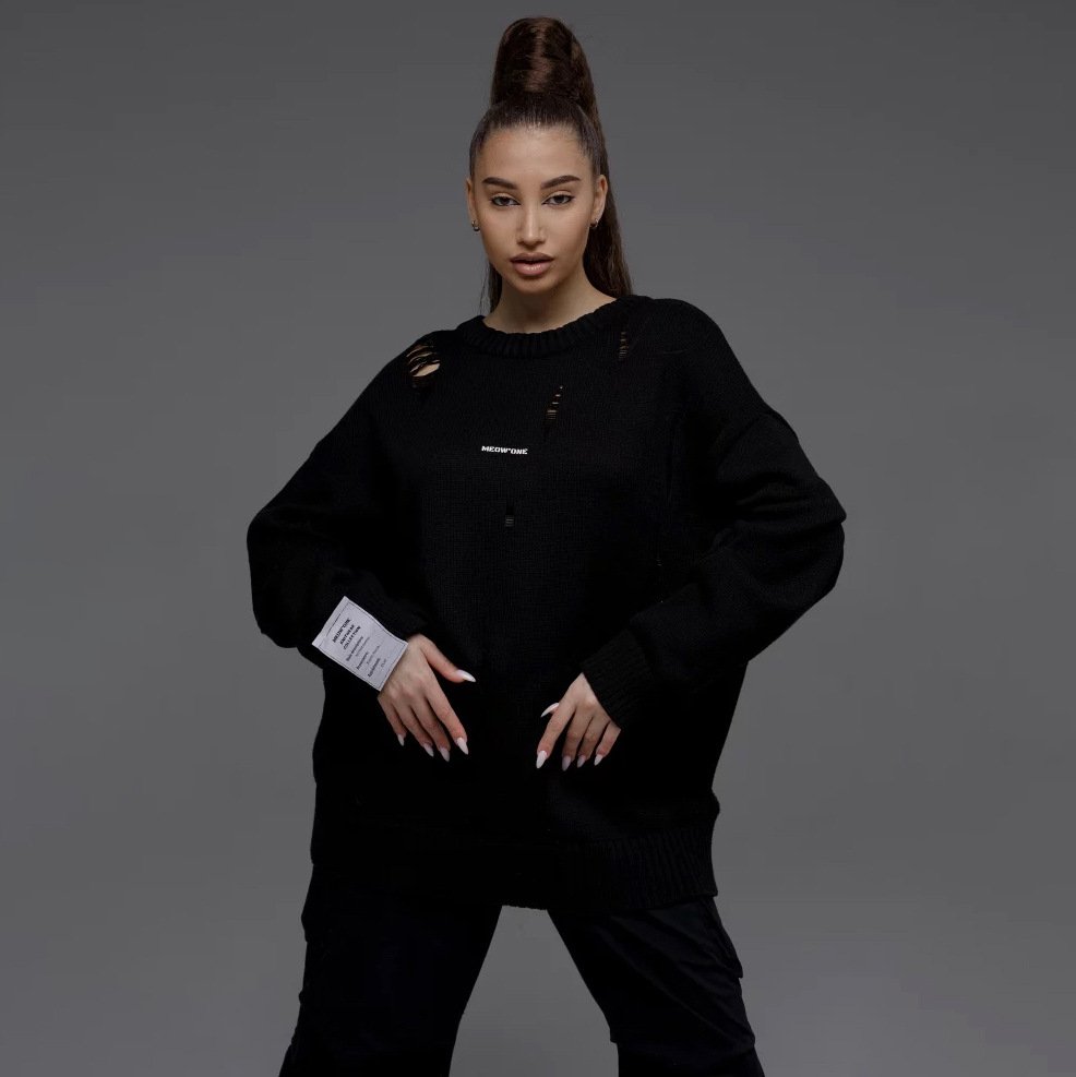 亚马逊欧美休闲破洞圆领毛衣女秋冬季2023新款宽松长袖针织衫外套