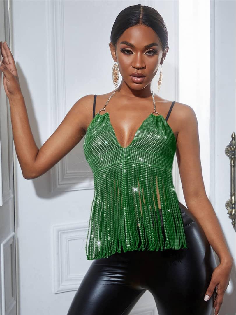 Experience the ultimate in style and glamour with our Shine with Kenia fringes Metallic top. The fringes add a touch of playfulness, while the metallic fabric gives it a sophisticated edge. Be the center of attention at any event with this must-have statement piece.