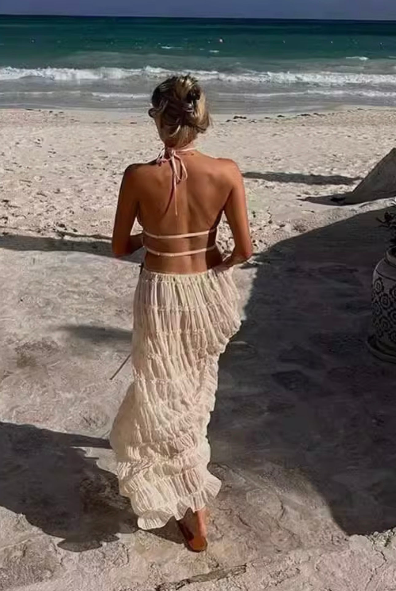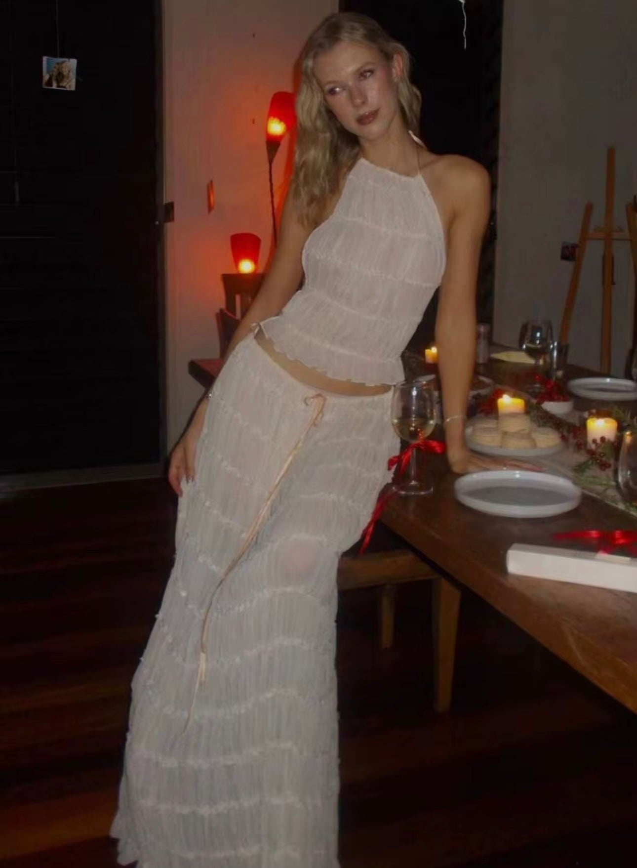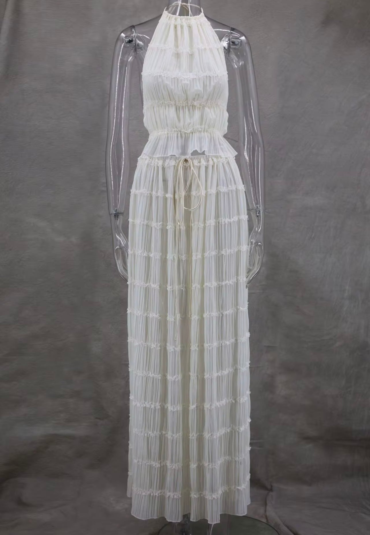 UCVOGUE two piece skirt suit set halter pleated backless lace crop top